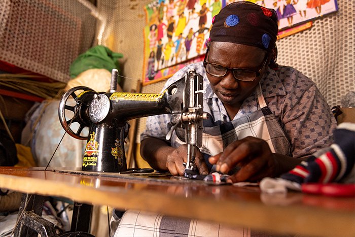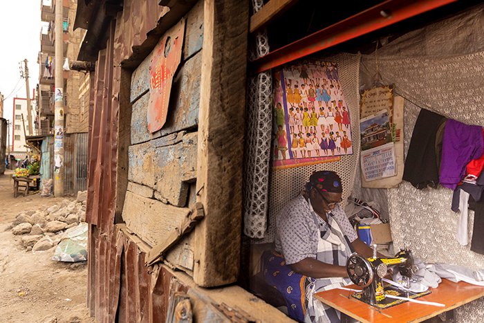 “Before the pandemic struck, I was a vegetable seller in Korogocho market. The business was affected because of the containment measures. Food was not coming into the city, my daughter then passed on and we had to find a way to cater for the entire family.” adds Serah. Serah now does tailoring largely making income from repairs and small orders for school from the community. This is her lifeline for her family. It provides not only food, but also caters for school fees for the children.